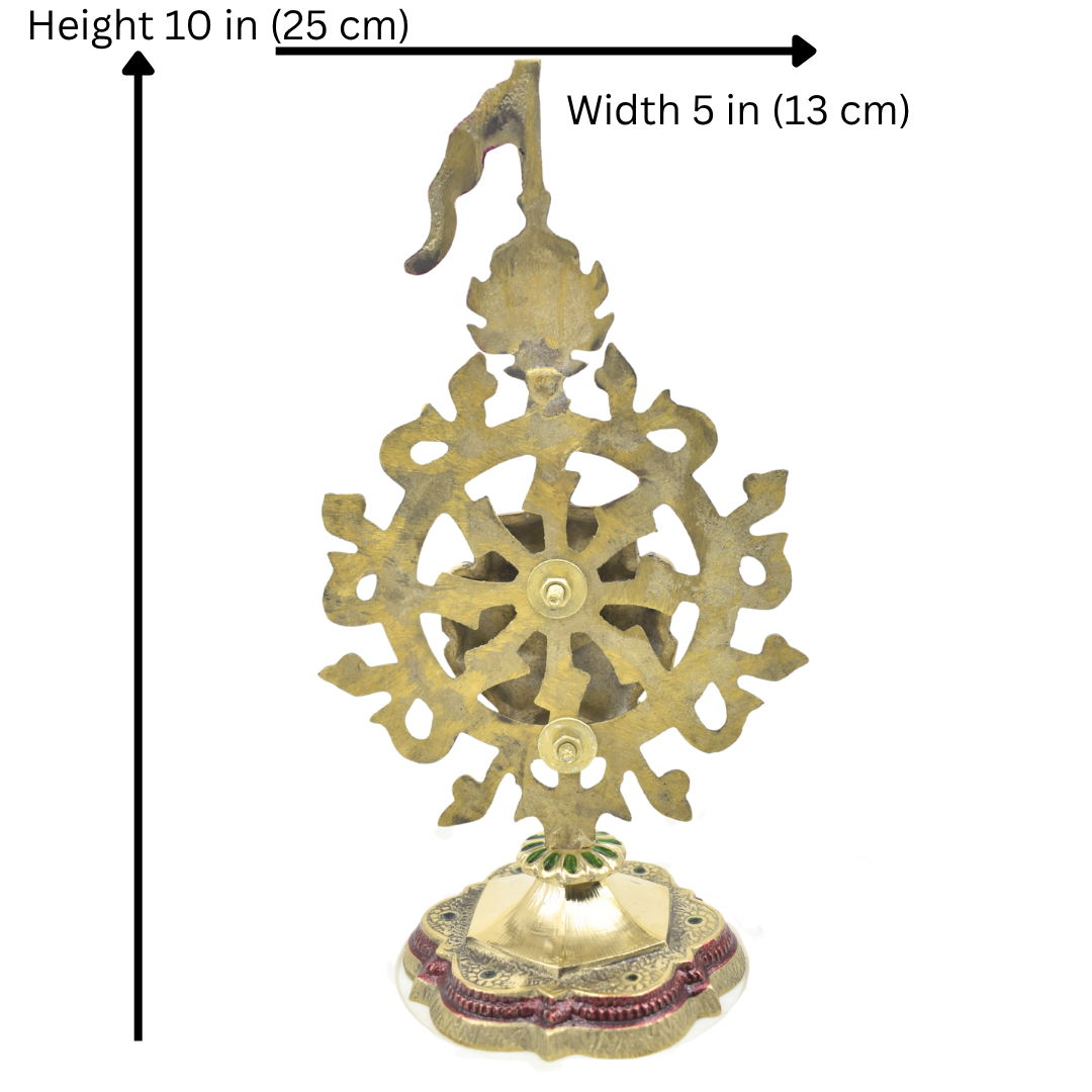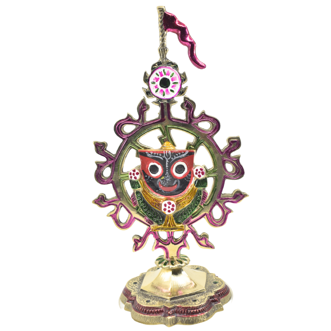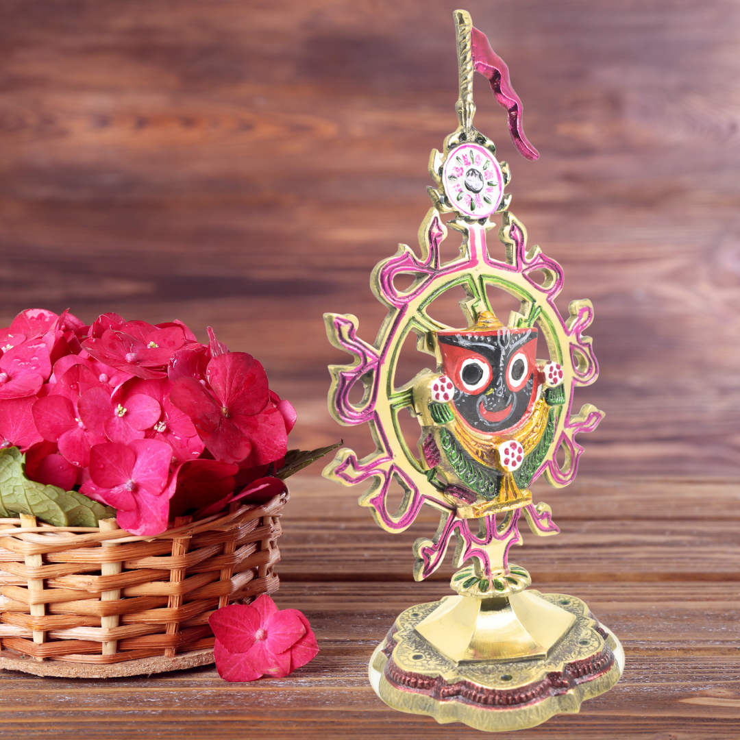 This 10-inch handcrafted brass idol features Lord Jagannath positioned within a detailed brass Nilachakra, reflecting the sacred symbolism of the Jagannath Temple in Puri. The Nilachakra is a powerful spiritual emblem believed to bring divine protection and blessings. Ideal for home altars, festive decorations, or gifting, this brass showpiece combines devotional significance with elegant design. Proudly made in India, it showcases the fine craftsmanship of traditional Indian artisans.
