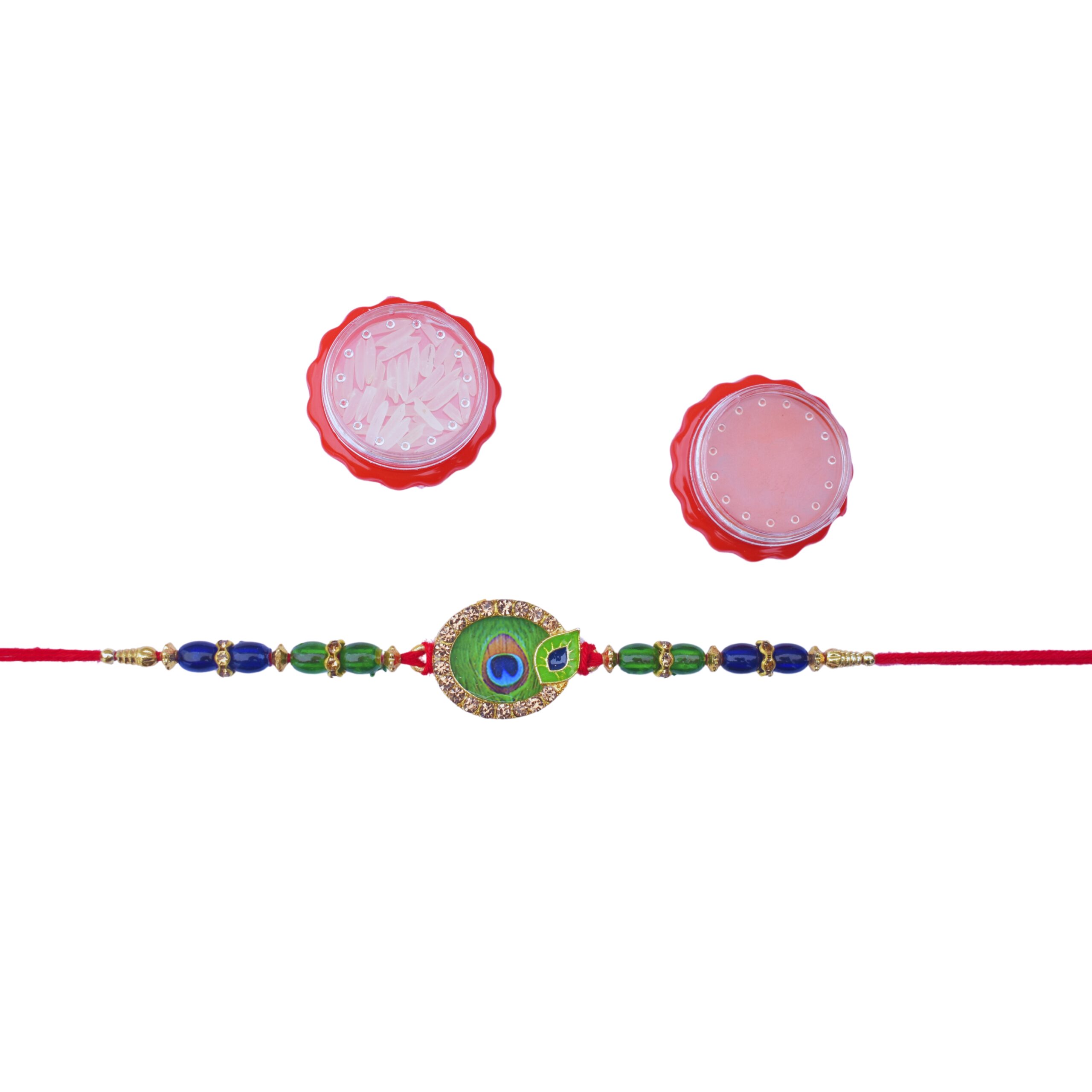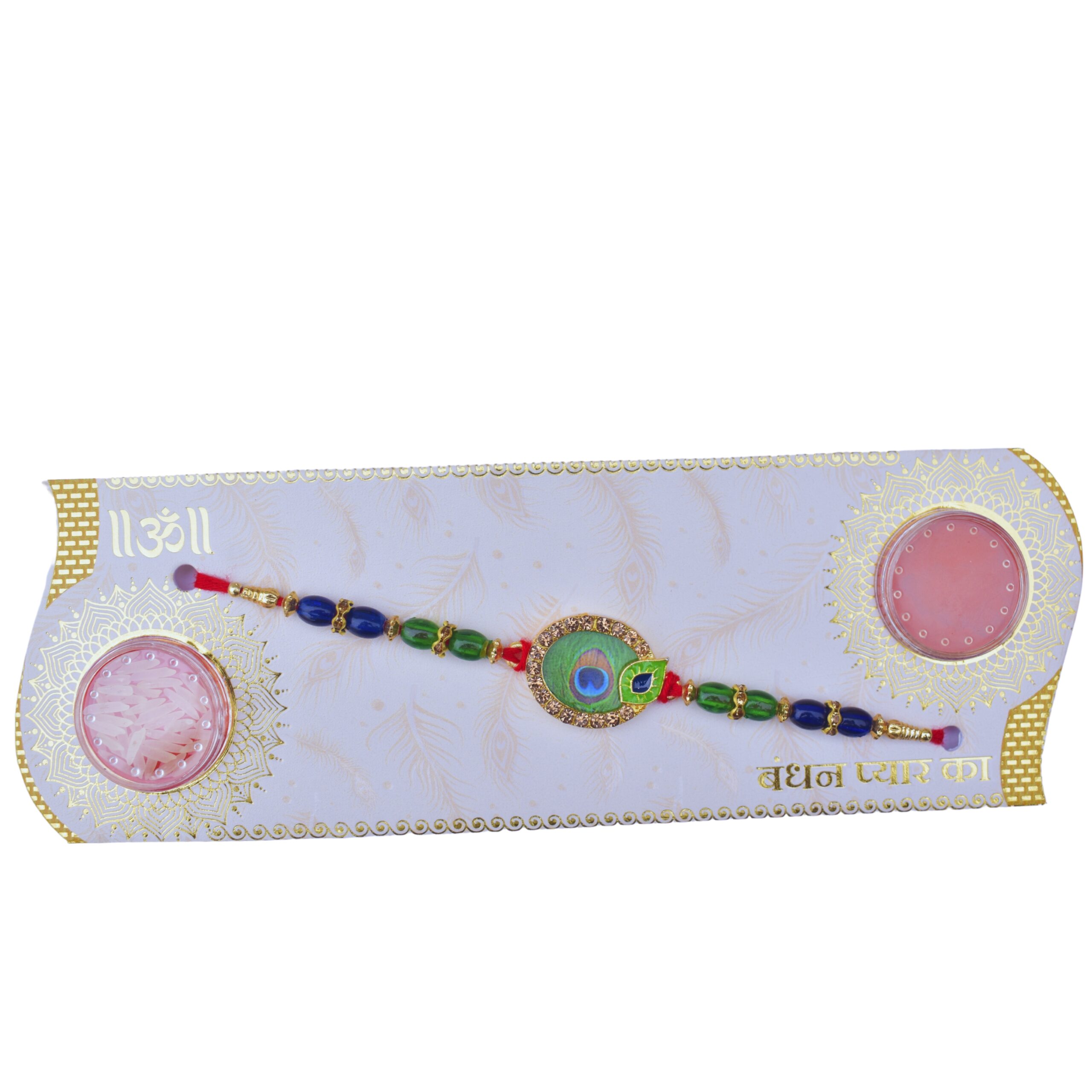 Celebrate Raksha Bandhan with this exquisite Krishna Mayur Rakhi set, which includes Sindoor and Chawal for your traditional rituals. The Rakhi features an intricately designed peacock feather (Mayur) motif, symbolizing beauty and grace, along with Lord Krishna’s charm. Crafted with vibrant colors and high-quality materials, this Rakhi is perfect for expressing your love and protection for your brother. The set comes in festive packaging, making it ready for gifting and adding a special touch to the celebration.